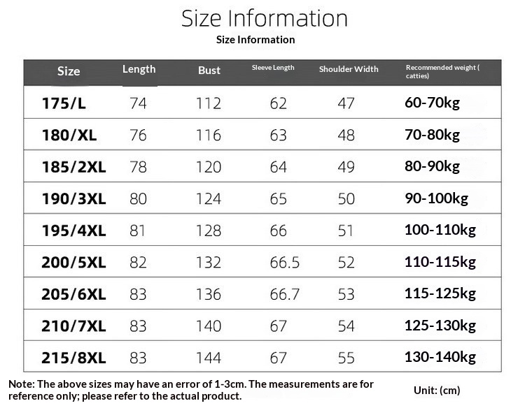 Size: 175, 180, 185, 190, 195, 200, 205, 210, 215